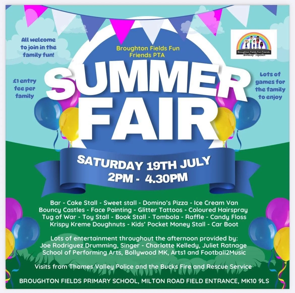 Broughton Fields Fun Friends PTA Summer Fair - Saturday 19th July - 2pm to 4:30pm - Broughton Fields Primary School, Milton Road, Broughton, MK10 9LS (see poster below)